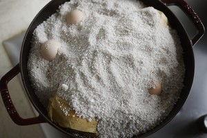 2. 焗制:将腌制好的鸡肉放在炒热的盐包上,用盐粒将鸡肉完全包裹住。